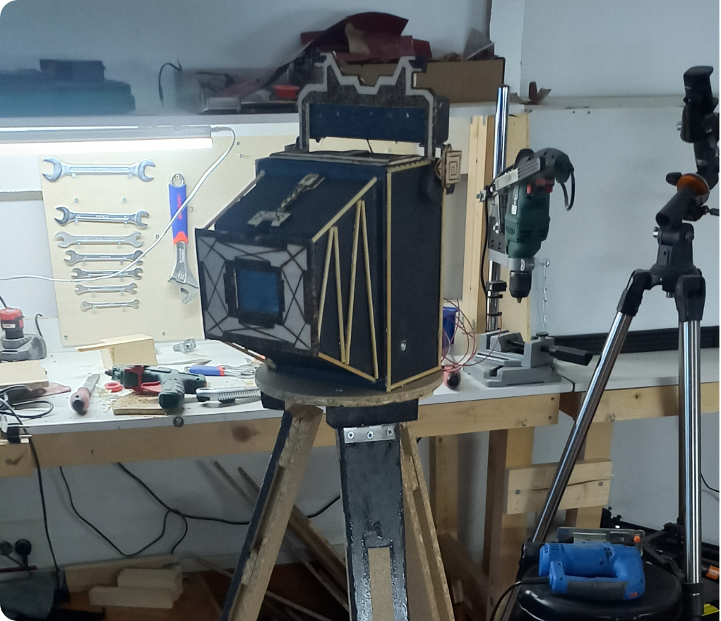 Projeto de máquina fotográfica que simula as máquinas antigas. Feito a partir de uma máquina digital, a característica desta máquina é que o ecrã LCD foi montado na parte frontal juntamente com a câmara para o utilizador com o recurso a um comando com um botão possa captar a sua fotografia sendo que o LCD tem a utilidade de visualização da foto antes de ser captada.